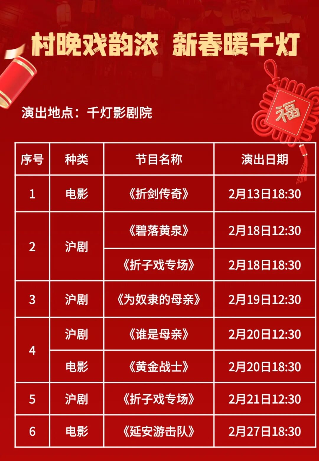 千燈鎮(zhèn)社會(huì)事業(yè)辦公室特別策劃“村晚戲韻濃 新春暖千燈”活動(dòng),將在千燈影劇院輪播經(jīng)典滬劇與熱門電影,在光影流轉(zhuǎn)間,感受傳統(tǒng)藝術(shù)的深厚魅力與節(jié)日的溫馨氛圍。所有場次均免費(fèi)開放,座位有限,先到先得。
